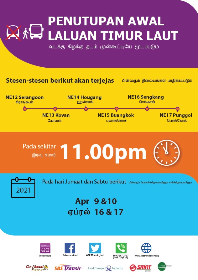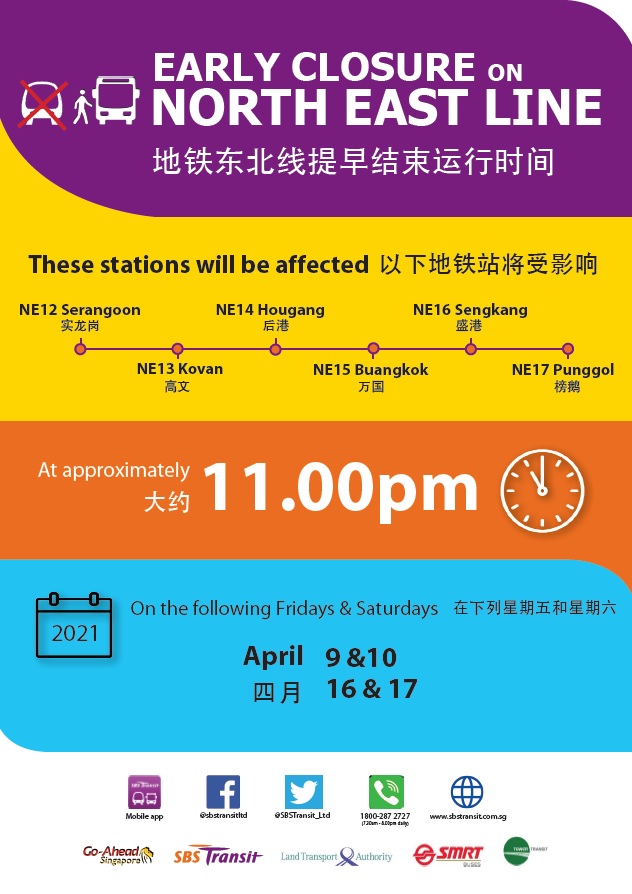 Starting from 9 and 10 April, and on 16 and 17 April, NEL stations between NE12 Serangoon and NE17 Punggol will close earlier at about 11.00pm.