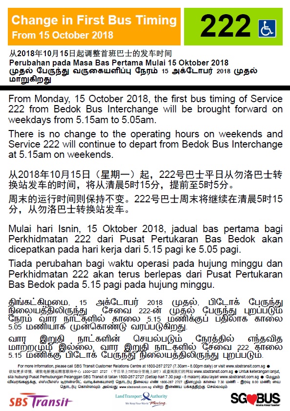 Change in First Bus Timing for Service 222