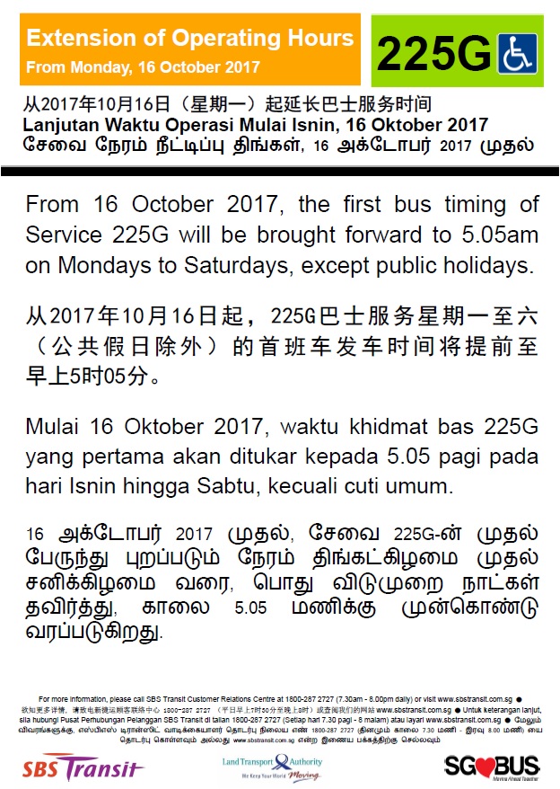 Change in first bus timing for Service 225G