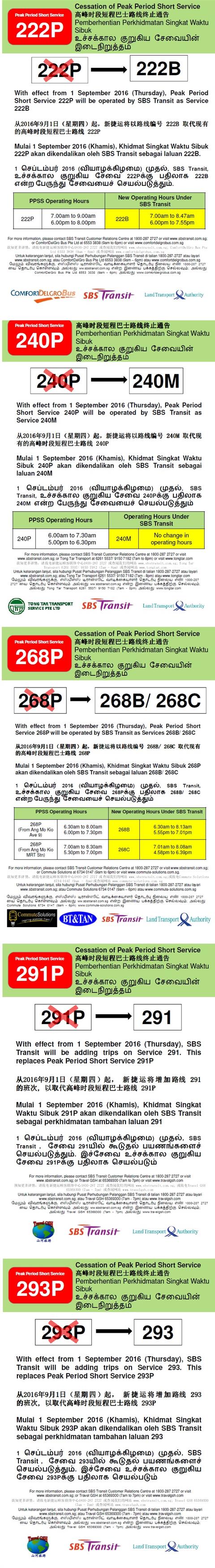 From 1 September 2016, SBS Transit will operate Services 222B, 240M and 268B/268C