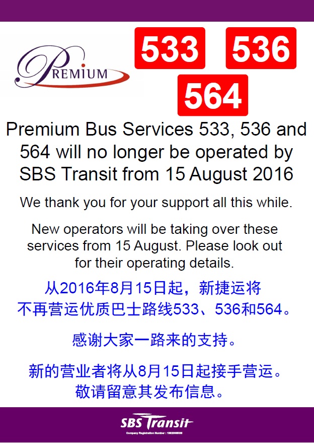 From 15 August 2016, Premium Bus Services 533, 536 and 564 will no longer be operated by SBS Transit