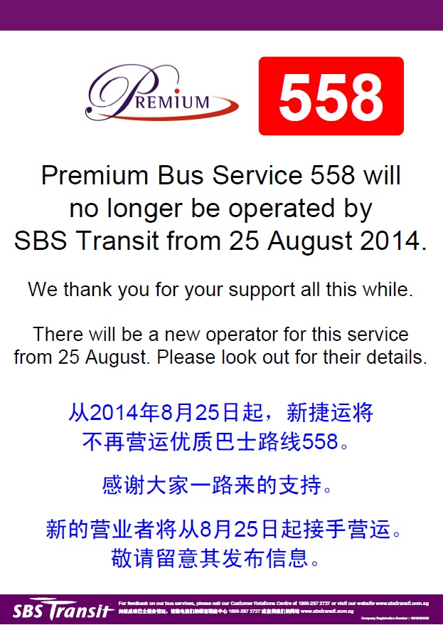 Premium Bus Service 558 will no longer be operated by SBS Transit from 25 August 2014