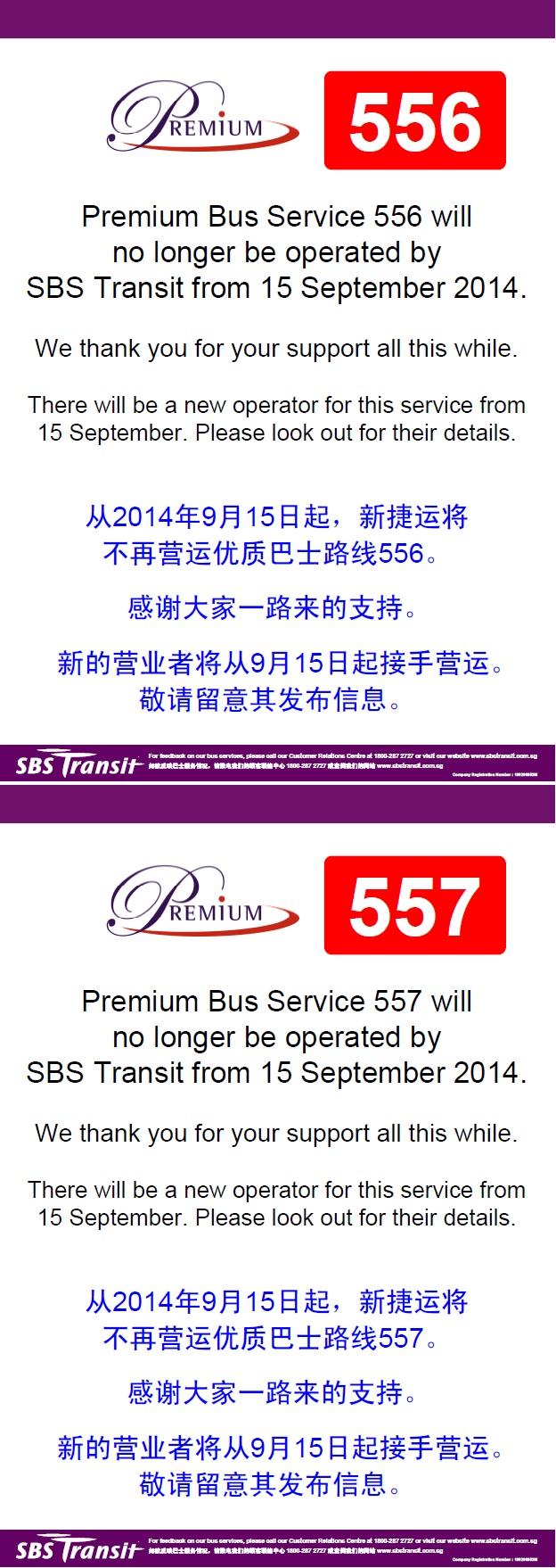 Premium Bus Services 556 & 557 will no longer be operated by SBS Transit from 15 September 2014