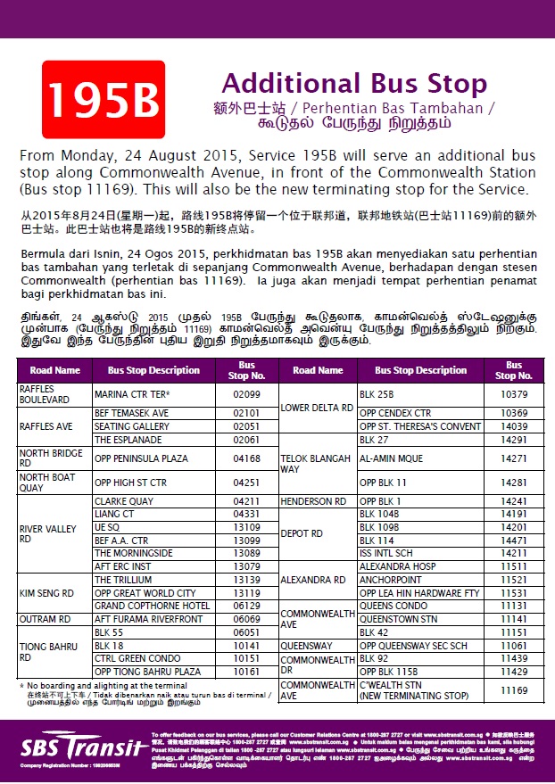 Service 195B will call at a new bus stop from Monday, 24 August 2015