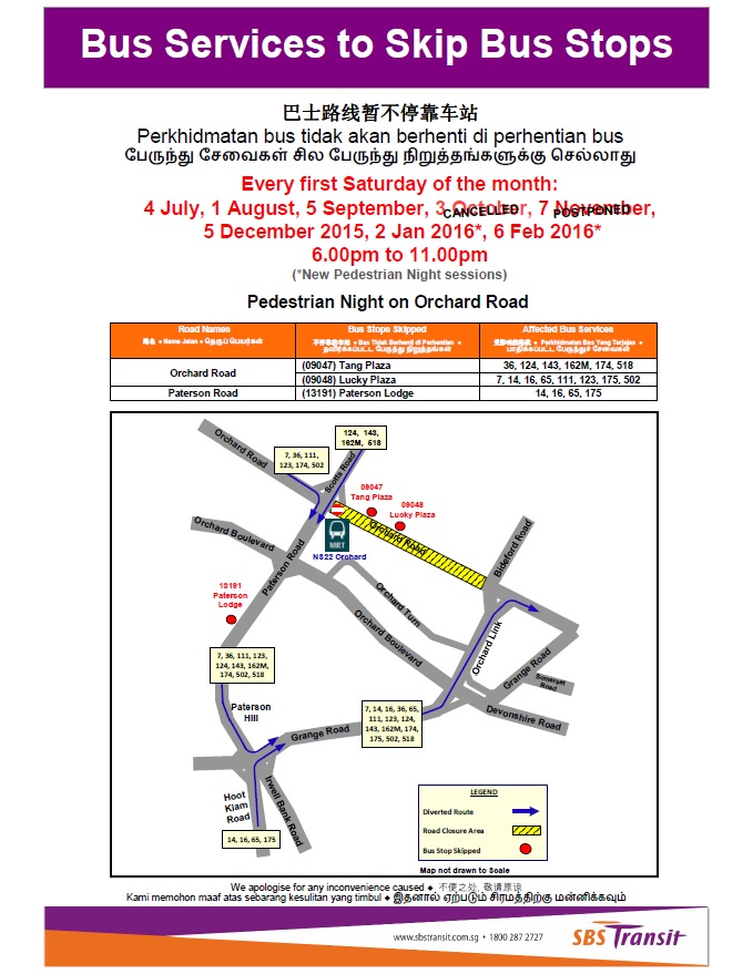 - The Pedestrian Night to be held on Sat, 7 Nov, has been postponed. Hence, bus services will not be affected by road closures in Orchard Road.