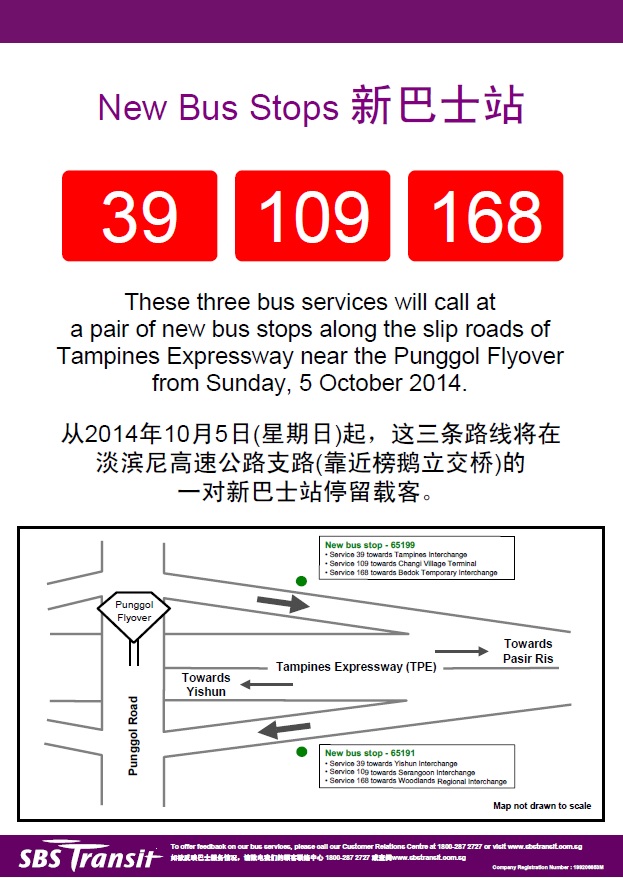 These three bus services will call at a pair of new bus stops along the slip roads of Tampines Expressway near the Punggol Flyover from Sunday, 5 October 2014
