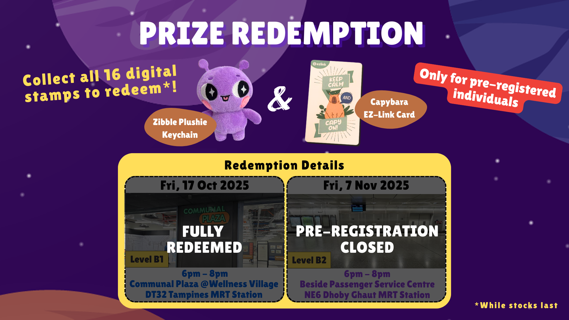 - Show the confirmation email and your unique redemption code to our staff on Friday, 7 November 2025, between 6pm and 8pm, at NE6 Dhoby Ghaut MRT Station (next to the Passenger Service Centre) to redeem your prize.